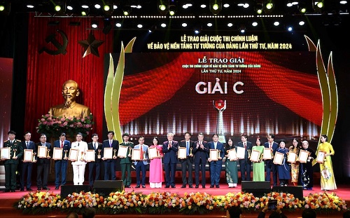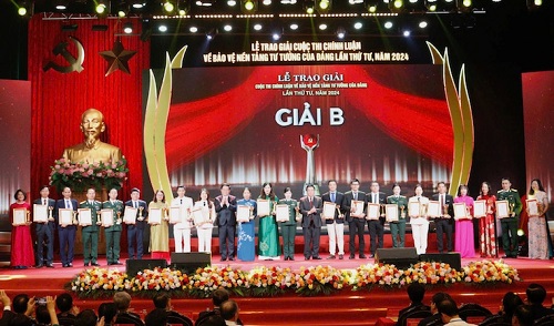 | Đồng chí Nguyễn Xuân Thắng, Giám đốc Học viện Chính trị Quốc gia Hồ Chí Minh, Chủ tịch Hội đồng Lý luận Trung ương, Phó Trưởng Ban Chỉ đạo 35 Trung ương, Trưởng Ban Chỉ đạo Cuộc thi và đồng chí Nguyễn Trọng Nghĩa, Trưởng Ban Tuyên giáo Trung ương, Phó Trưởng Ban Chỉ đạo 35 Trung ương trao giải B cho tác giả, nhóm tác giả |