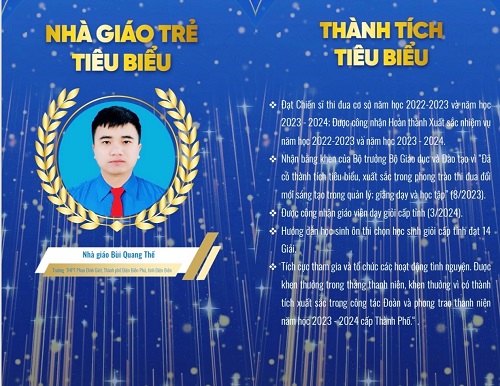 Trong số giáo viên, giảng viên được chọn trao giải thưởng “Nhà giáo trẻ tiêu biểu” cấp Trung ương lần thứ IV - năm 2024, Điện Biên vinh dự có 02 đồng chí đạt giải thưởng: Đồng chí Bùi Quang Thế, Giáo viên Trường THPT Phan Đình Giót, Thành phố Điện Biên Phủ và đồng chí Nguyễn Văn Tuyên, Giảng viên Trường Cao đẳng Kinh tế - Kỹ thuật Điện Biên.