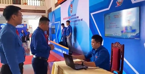 Đoàn viên chi đoàn Sở Thông tin và Truyền thông hỗ trợ điểm danh đại biểu dự đại hội