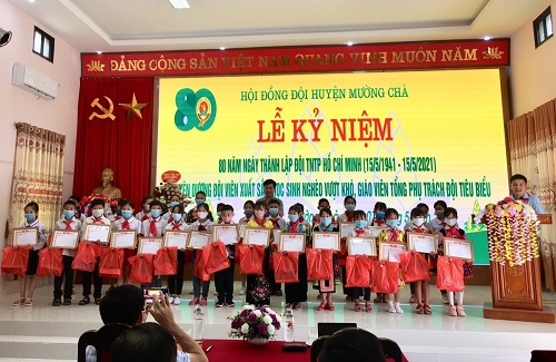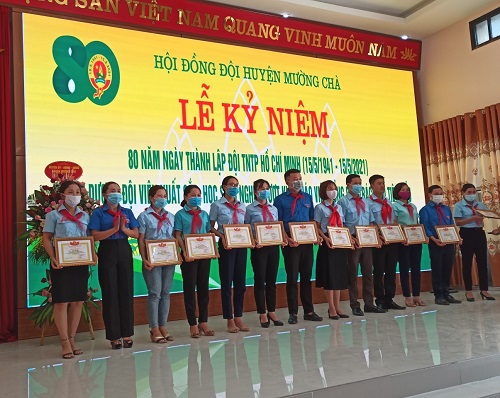 Giáo viên làm công tác Đội tiêu biểu được tuyên dương tại Lễ kỷ niệm. Tại buổi lễ, Uỷ Ban nhân dân huyện Mường Chà đã khen thưởng cho 03 tập thể , 7 cá nhân có thành tích xuất sắc trong công tác thiếu nhi. Nhân dịp này, Hội đồng Đội huyện Mường Chà tuyên dương 26 giáo viên tổng phụ trách Đội tại các trường học, Hội khuyến học huyện đã trao tặng 60 xuất quà trị giá mỗi xuất quà 300 nghìn đồng, Phòng Lao động thương binh & xã hội huyện trao tặng 60 xuất quà bao gồm vật dụng thiết yếu phục vụ trong sinh hoạt hàng ngày.