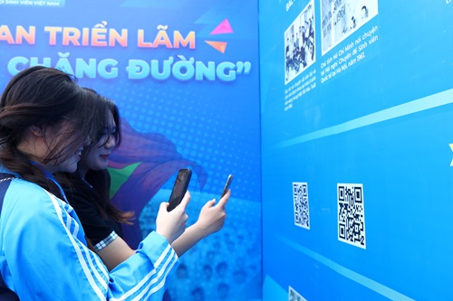 Các bạn sinh viên tim hiểu không gian triển lãm " “75 năm một chặng đường” tại ngày hội. Các bạn trẻ cũng có thời gian tìm hiểu không gian Triển lãm “75 năm một chặng đường” chào mừng kỷ niệm 75 năm ngày truyền thống phong trào học sinh, sinh viên và Hội Sinh viên Việt Nam (09/01/1950 - 09/01/2025) thể hiện thông điệp “Vững bản sắc, hòa chung tự hào”; phong trào “Sinh viên 5 tốt”, “Học sinh 3 tốt”, “Học sinh 3 rèn luyện”.
