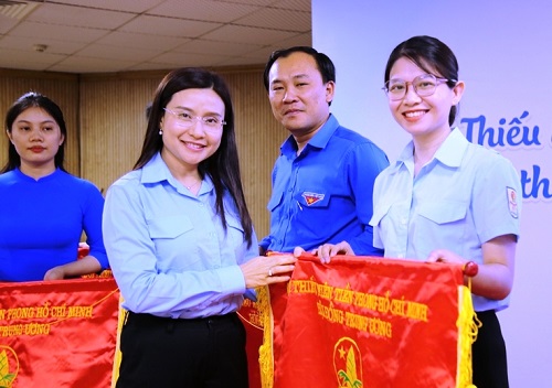 Đồng chí Nguyễn Phạm Duy Trang trao cờ thi đua cho đơn vị dẫn đầu trong công tác Đội