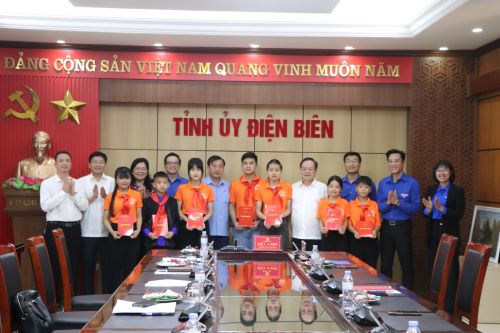 Ảnh 3. Lãnh đạo tỉnh Điện Biên tặng quà và chụp ảnh lưu niệm cùng các đại biểu dự Đại hội Cháu ngoan Bác Hồ toàn quốc lần thứ X. Phát biểu tại buổi gặp mặt, đồng chí Mùa A Sơn - Phó Bí thư Thường trực Tỉnh ủy chúc mừng các đại biểu được chọn tham dự Đại hội Cháu ngoan Bác Hồ toàn quốc lần thứ X, đồng thời nhấn mạnh: Đây là dịp để các cháu có cơ hội được trải nghiệm, hòa đồng cùng các đại biểu thiếu niên, nhi đồng, Cháu ngoan Bác Hồ trong cả nước tham gia các hoạt động của một sự kiện lớn đối với thiếu niên, nhi đồng cả nước.
