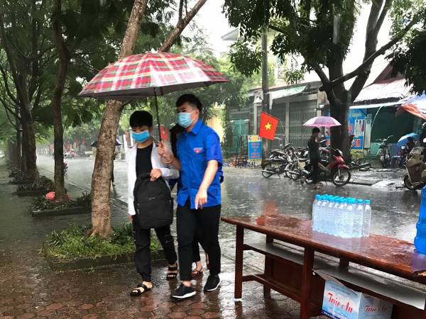 Tình nguyện viên đưa, đón các thí sinh khi trời mưa.