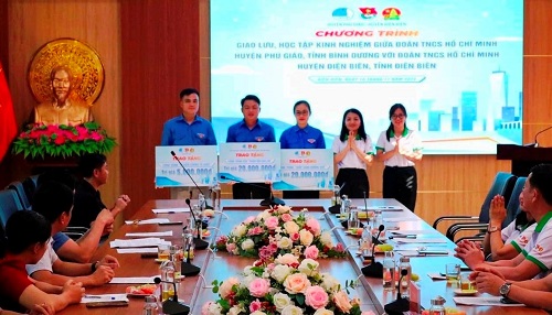 Tại Chương trình, các đồng chí lãnh huyện đã giới thiệu sơ nét về tình hình kinh tế - xã hội, quốc phòng - an ninh huyện Điện Biên và huyện Phú Giáo; đại diện Ban Thường vụ Huyện đoàn 02 huyện cũng giới thiệu sơ nét về hệ thống Đoàn, Hội, Đội và một số kết quả nổi bật của 02 đơn vị thời gian qua. Ban Thường vụ Huyện đoàn Phú Giáo - Đoàn khối các cơ quan và Doanh nghiệp tỉnh Bình Dương đã trao tặng bảng tượng trưng các công trình: Công trình thanh niên “Thắp sáng nông thôn” trị giá 20.000.000 đồng, tặng “Chăn ấm cho em” trị giá 20.000.000 đồng và Công trình “Vì biên cương tổ quốc” trị giá 5.000.000 đồng cho Huyện đoàn Điện Biên.