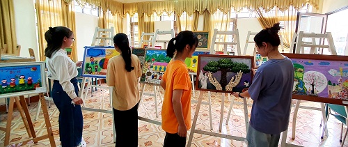 Hình ảnh tại cuộc thi. Ngay sau khi được phát động, Câu lạc bộ Truyền thông, Liên Chi đoàn, Chi đoàn đã tích cực tuyên truyền, hướng dẫn và yêu cầu đoàn viên sinh viên thu gom sỏi, đá và rác thải nhựa. Từ các nguyên liệu đã thu thập, bằng những kiến thức chuyên ngành được học ở các môn như Thủ công mỹ thuật, Phương pháp dạy học mỹ thuật, Hoạt động tạo hình… các đoàn viên, chi đoàn đã tạo ra 37 sản phẩm tranh sáng tạo với các chủ đề tuyên truyền biển đảo, bảo vệ môi trường….phù hợp với trẻ thơ để tham dự cuộc thi.