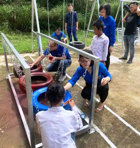 Đoàn viên Thành đoàn Điện Biên Phủ góp công sức hoàn thiện, lắp ráp khu vui chơi