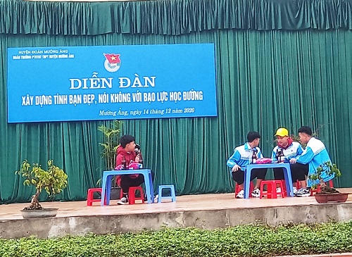 Năm học 2020-2021, 100% các Đoàn trường THPT, PTDTNT THPT trên địa bàn huyện đã tổ chức diễn đàn bằng nhiều hình thức phong phú, thu hút ĐVTN, học sinh tham gia như: thể hiện tiểu phẩm truyên truyền về nội dung ngăn chặn bạo lực học đường; chia sẻ, trao đổi, cổ vũ những thói quen tốt, hành động đẹp trong việc phòng chống bạo lực học đường; phổ biến kiến thức pháp luật có liên quan đến hậu quả do bạo lực học đường gây ra; kỹ năng xử lý tình huống để ngăn chặn bạo lực học đường hoặc tham gia giải quyết, đấu tranh với các hành vi bạo lực học đường; chia sẻ những câu chuyện đẹp về tình bạn trong môi trường học đường, trong cuộc sống, định hướng việc xây dựng tình bạn đẹp trong học sinh…