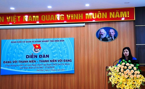 Đ/C Hoàng Thị Mai - Bí thư Đoàn cơ sở Công ty Điện Lực Điện Biên tham luận tại Diễn đàn. Diễn đàn với mục đích củng cố và khẳng định niềm tin của đoàn viên thanh niên vào sự lãnh đạo của Đảng, tạo không khí phấn khởi, cổ vũ đoàn viên thanh niên đẩy mạnh phong trào thi đua yêu nước nhân kỷ niệm 60 năm ngày thành lập Đoàn TNCS Hồ Chí Minh tỉnh Điện Biên. Đồng thời cũng là dịp để đoàn viên, thanh niên trong khối thể hiện tâm tư, nguyện vọng, đề xuất, kiến nghị, đóng góp ý kiến tham gia xây dựng Đảng trong sạch vững mạnh.