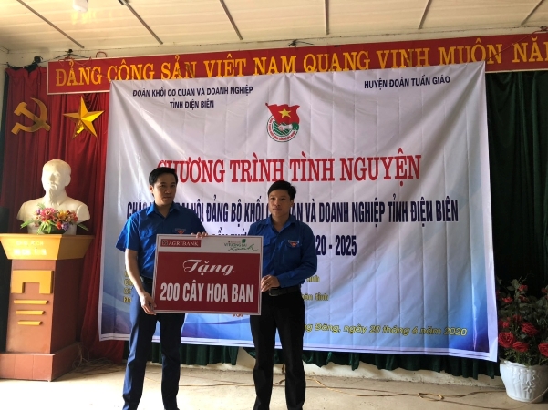Đồng chí Bùi Thanh Tùng, Bí thư chi đoàn Ngân hàng Nông nghiệp và PTNT tỉnh Điện Biên trao biển tượng trưng 200 cây hoa Ban cho Huyện Đoàn Tuần Giáo.