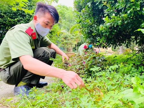 Đoàn viên Công an huyện dọn dẹp vỉa hè, tỉa cây làm cỏ.