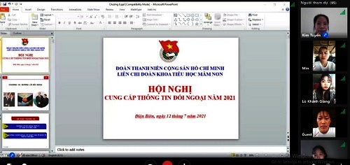 Hội nghị cung cấp thông tin đối ngoại năm 2021 của Liên Chi khoa Tiểu học – Mầm non. Thực hiện Kế hoạch số 312-KH/TĐTN-XDĐ của Tỉnh Đoàn Điện Biên về việc tổ chức các hoạt động thông tin đối ngoại, từ tháng 7-8/2021, Đoàn trường CĐSP Điện Biên đã chỉ đạo các Liên Chi đoàn, Chi đoàn trực thuộc tổ chức 6 buổi thông tin đối ngoại qua phần mềm Zoom và Zavi cho 566 ĐVTN. Các báo cáo viên đã tập trung thông tin cho ĐVTN các nội dung: Quán triệt Nghị quyết Đại hội Đảng toàn quốc lần thứ XIII; Chỉ thị 25-CT/TW của Ban Bí thư về “Đẩy mạnh và nâng cao tầm đối ngoại đa phương đến năm 2030”; đóng góp của Việt Nam tại Liên hợp quốc, ASEAN và các diễn đàn, tổ chức quốc tế khác, trong đó có Việt Nam trúng cử vào một số cơ quan quan trọng của Liên hợp quốc và các tổ chức quốc tế, thành viên không thường trực Hội đồng Bảo an Liên hợp quốc nhiệm kỳ 2020-2021; Quyết định số 273/QĐ-TTg ngày 06/3/2018 của Thủ tướng Chính phủ phê duyệt Quy hoạch phát triển hệ thống thông tin đối ngoại khu vực cửa khẩu quốc tế phục vụ nhiệm vụ thông tin đối ngoại đến năm 2020, định hướng đến năm 2030 và văn bản số 1074/BTTTT-TTĐN ngày 12/4/2018 của Bộ Thông tin và Truyền thông hướng dẫn triển khai thực hiện Quyết định số 273/QĐ-TTg ; Quyết định số 1191/QĐ-TTg ngày 05/8/2020 của Thủ tướng Chính phủ về việc phê duyệt mục tiêu, nhiệm vụ, giải pháp đổi mới và nâng cao năng lực công tác thông tin tuyên truyền và thông tin đối ngoại góp phần xây dựng biên giới hòa bình, hữu nghị, hợp tác và phát triển và văn bản số 3890/BTTTT-TTĐN ngày 08/10/2020 về hướng dẫn thực hiện Quyết định số 1191/QĐ-TTg. Đặc biệt, từ đầu năm 2021 đến nay, Đoàn trường đã chỉ đạo các đơn vị trực thuộc tuyên truyền các sự kiện nổi bật của tỉnh và đất nước, các ngày lễ lớn, đặc biệt là sự kiện Bầu cử đại biểu Quốc hội khóa XV, bầu cử HĐND các cấp nhiệm kỳ 2021 - 2026; tuyên truyền thành tựu to lớn của Việt Nam sau 35 năm đổi mới trong các buổi sinh hoạt Chi đoàn, nhóm Zalo chung của các đơn vị và trên các trang fanpage. Ngoài ra, Đoàn trường còn lồng ghép tuyên truyền công tác biển, đảo; công tác biên giới, lãnh thổ; giới thiệu, quảng bá các thành tựu, tiềm năng, thế mạnh, sản phẩm hàng hóa của tỉnhtrong các buổi họp của đơn vị.