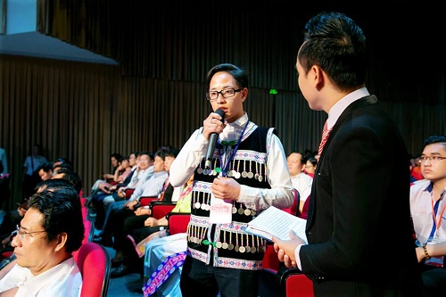 Sinh viên Giàng A Sĩ trả lời phỏng vấn của Ban Tổ chức tại Lễ khai mạc Ngày hội
