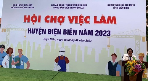 Bà Nguyễn Thu Thủy – Quyền Giám đốc Trung tâm Giới thiệu việc làm tỉnh Điện Biên phát biểu. Hội chợ việc làm đã mở ra nhiều cơ hội kết nối cung - cầu lao động, đẩy mạnh công tác giải quyết việc làm, phát triển thị trường lao động còn nhiều khó khăn, thách thức. Hội chợ còn là dịp để người lao động chưa có việc làm, thiếu việc làm có nhu cầu tìm việc làm; giúp học sinh các trường THPT trên địa bàn huyện có thể tìm hiểu về thị trường lao động qua việc lắng nghe, tiếp xúc và tìm hiểu sâu hơn những nhu cầu của các nhà tuyển dụng, từ đó định hướng cho mình con đường nghề nghiệp trong tương lai phù hợp với bản thân mình