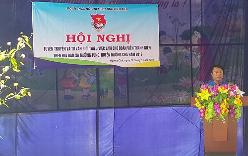 phát biểu khai mạc Hội nghị. Phát biểu tại hội nghị, đồng chí Đặng Thành Huy - Ủy viên BCH Trung ương Đoàn, Bí thư Tỉnh đoàn Điện Biên nhấn mạnh Hội nghị có ý nghĩa giúp thanh niên nông thôn hiểu rõ chính sách về lao động, việc làm; quyền lợi, nghĩa vụ và trách nhiệm khi tham gia xuất khẩu lao động và tìm kiếm việc làm trong nước phù hợp với năng lực, trình độ đào tạo của người lao động góp phần giải quyết việc làm, giảm tỷ lệ thất nghiệp trên địa bàn. Đồng thời, chỉ đạo Huyện đoàn Mường Chà trong thời gian cần triển khai thực hiện tốt một số nội dung như: Phối hợp với Đài Truyền thanh và Truyền hình huyện thường xuyên cập nhật, đăng tải các thông tin về tình hình triển khai các hoạt động việc làm; chỉ đạo các cơ sở Đoàn tổ chức tuyên truyền sâu rộng tới đông đảo ĐVTN và nhân dân về nghề nghiệp, việc làm; tiếp tục phối hợp với Trung tâm Giới thiệu việc làm tỉnh tổ chức tuyên truyền chính sách pháp luật về xuất khẩu lao động, việc làm cho ĐVTN; đẩy mạnh hoạt động tư vấn hướng nghiệp cho thanh niên, trong đó chú trọng hoạt động tư vấn hướng nghiệp đến đối tượng học sinh khối THPT.