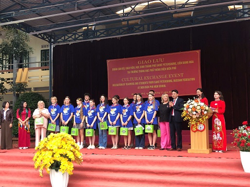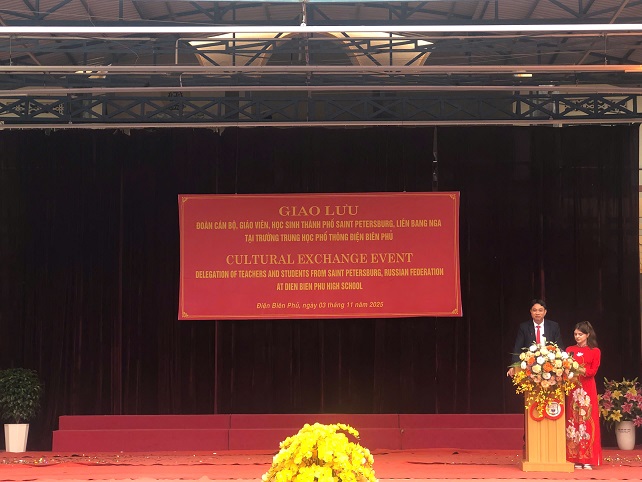 Đoàn cán bộ và học sinh Liên bang Nga, với 19 thành viên (gồm 03 cán bộ dẫn đoàn và 16 học sinh Trường Trung học Lyceum số 488), đang có chuyến thăm kéo dài 12 ngày (từ 29/10 đến 09/11/2025) tại tỉnh Điện Biên. Mục đích của chuyến đi là tăng cường sự hiểu biết, giao lưu văn hóa và học hỏi trong môi trường quốc tế. Một trong những điểm nhấn quan trọng của lịch trình là buổi gặp mặt chính thức tại Trường THPT Điện Biên Phủ. Ngay từ 8h45'sáng, sân trường THPT Điện Biên Phủ đã rực rỡ và trang trọng. Đội danh dự của trường trong trang phục áo dài truyền thống, tay cầm dải lụa hoa, vẫy cờ Việt Nam và Liên bang Nga, xếp thành hai hàng dài. Đoàn đại biểu Nga, dẫn đầu bởi Bà Nikishina Natalia – Phó Trưởng Ban hành chính Quận Vyborg và Cô Osennova Natalia – Hiệu trưởng Trường Lyceum số 488, 01 phiên dịch, 16 học sinh được cán bộ, giáo viên và học sinh trường THPT Điện Biên Phủ nồng nhiệt chào đón. Những nụ cười rạng rỡ, những cái bắt tay thân thiện cùng tiếng vỗ tay rộn rã đã phá vỡ mọi rào cản địa lí và ngôn ngữ.
