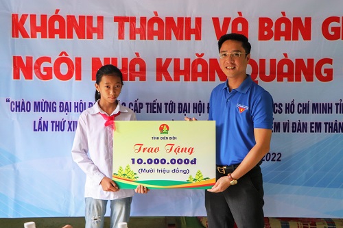 Anh Đặng Thành Huy - UVBCH Trung ương Đoàn, Tỉnh ủy viên, Bí thư Tỉnh đoàn, chủ tịch Hội đồng đội trao kinh phí hỗ trợ làm nhà. Ngôi nhà hoàn thành với tổng diện tích sử dụng là 35m2, tường xây kiên cố, nền láng xi măng và mái lợp tôn chống nóng. em Lường Thị Tuyết sinh ra trong gia đình đặc biệt khó khăn, thuộc hộ nghèo. Bố Tuyết bị tai nạn mất sớm, mẹ đi làm xa, để lại 3 chị em nương tựa nhau.