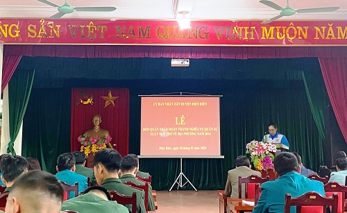 Quang cảnh tại buổi Lễ. Sau 2 năm học tập, rèn luyện trong môi trường Quân đội, 96 thanh niên của huyện Điện Biên đã hoàn thành nghĩa vụ quân sự trở về địa phương trong niềm phấn khởi của gia đình, cấp ủy, chính quyền và nhân dân địa phương. Vinh dự được phát biểu tại Hội nghị, đồng chí Bí thư Huyện đoàn Điện Biên đã chúc mừng, động viên quân nhân hoàn thành nghĩa vụ quân sự trở về địa phương đợt này; trong thời gian tại ngũ, phát huy truyền thống quê hương Điện Biên anh hùng, các quân nhân đã ra sức phấn đấu học tập, rèn luyện, hoàn thành nghĩa vụ quân sự; chấp hành tốt đường lối, chủ trương của Đảng, chính sách, pháp luật của Nhà nước, kỷ luật của Quân đội.