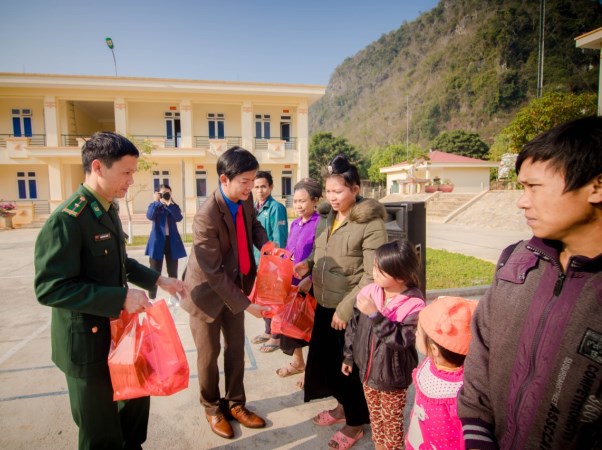 Lãnh đạo huyện Đoàn và Chỉ huy đồn Biên Phòng Pa Thơm trao quà Tết cho nhân dân tại xã Pa Thơm.