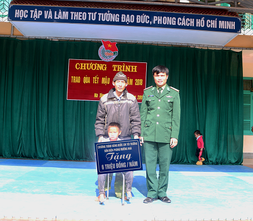 Cũng nằm trong chương trình trao quà Tết Mậu Tuất 2018, thực hiện Quy chế phối hợp với Phòng chính trị BĐBP tỉnh Điện Biên; Viettel Điện Biên, để thực hiện có hiệu quả chương trình “ Nâng bước em đến trường” , Huyện đoàn Điện Biên đã phối hợp với Đồn Biên Phòng Mường Nhà; Viettell Điện Biên tổ chức nhận đỡ đầu và hỗ trợ kinh phí hàng năm cho: Em học sinh: Mùa A Củ - học sinh lớp 1 Trường Tiểu học số 2 xã Na Tông, huyện Điên Biên bị khuyết tật với tổng số tiền hỗ trợ 73 triệu đồng.
