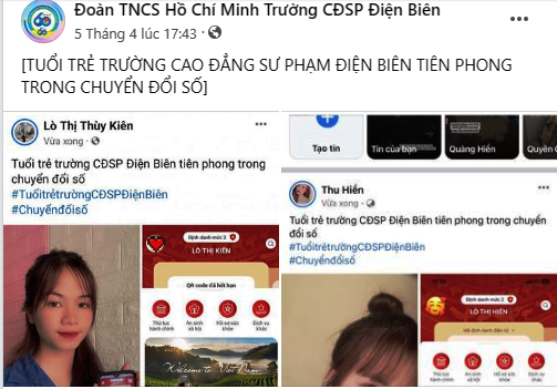 Ngoài ra, Đoàn trường đã triển khai và thực hiện nghiêm túc đề án 06. Tính đến thời điểm hiện tại, gần 100% đoàn viên thanh niên đã kích hoạt định danh điện tử; cài đặt ứng dụng VneID; cài đặt, đăng nhập tài khoản trên cổng dịch vụ công; huy động 154 đoàn viên thanh niên tham gia hiến máu nhân đạo tình nguyện đợt 1/2023 được 100 đơn vị máu hiến tặng; cử 50 đoàn viên thanh niên tham gia chăm sóc người hiến máu tại nhà thiếu nhi tỉnh Điện Biên tại Lễ hội Xuân Hồng năm 2023; chỉ đạo 150 đoàn viên thanh niên dọn vệ sinh nhà đa năng phục vụ cuộc thi KHKT học sinh trung học cấp tỉnh năm 2022 – 2023.
