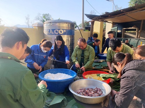 Tham gia hoạt động gói bánh chưng tặng cho nhân dân có hoàn cảnh khó khăn.