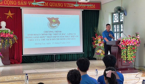 Thực hiện Chương trình công tác Đoàn và phong trào thanh thiếu nhi năm 2024; các văn bản chỉ đạo của Tỉnh đoàn Điện Biên, Ban Tuyên giáo Thị ủy; đẩy mạnh việc học tập và làm theo tư tưởng, đạo đức, phong cách Hồ Chí Minh; bồi dưỡng giáo dục, đạo đức cách mạng cho cán bộ, ĐVTN, Ban Thường vụ Thị đoàn Mường Lay chủ trì, phối hợp Trung tâm chính trị thị xã Mường Lay tổ chức 02 buổi sinh hoạt chính trị với chủ đề “Nhớ về Bác - Lòng ta trong sáng hơn”, kỷ niệm 55 năm thực hiện di chúc của Chủ tịch Hồ Chí Minh (1969-2024) với sự tham gia của hơn 50 cán bộ Đoàn, Hội LHTN, thành viên Câu lạc bộ lý luận trẻ và 80 ĐVTN là lực lượng nòng cốt.
