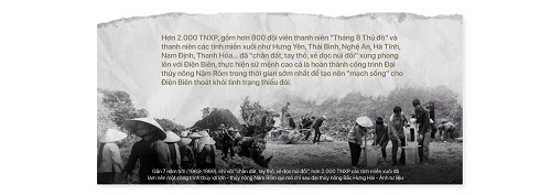 "Hồi đó từ Hà Nội lên Điện Biên, đi ôtô nhưng cũng mất đến bốn ngày đường. Cô bạn thanh niên xung phong cùng xe say xe, mình chỉ đỡ đàn em chăm sóc, thế rồi lên tới Điện Biên, vẫn chăm sóc nhau rồi yêu nhau", ông lão 80 tuổi hồi ức về cuộc lên đường của đội TNXP tình nguyện thủ đô 55 năm trước mà ngỡ như mới hôm qua, ánh mắt nhìn bà cụ bên cạnh vẫn long lanh như khi 20 tuổi. Bà Nguyễn Thị Thơ tiếp lời chồng: "Chúng tôi yêu nhau từ năm 1963, đến khi cưới nhau thì công trình sắp hoàn thành (1968) và ở lại Điện Biên cho đến hôm nay. Tôi nhà vốn ở Cầu Giấy, Hà Nội, hồi ấy 17 tuổi, nặng chưa đầy 35kg nhưng khi thấy anh trai cả xung phong lên Điện Biên thì tôi cũng lấy trộm hộ khẩu, viết đơn xin đi, nhưng vì nhẹ cân quá nên lần đầu bị loại. Hơn nửa năm sau, với quyết tâm theo anh lên xây dựng công trình thủy nông Nậm Rốm, tôi đã "ăn thật nhiều, ngủ thật nhiều" để cân nặng đủ 40kg để được chọn vào đội TNXP Tháng Tám thủ đô".