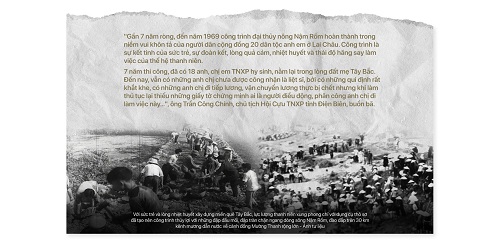 Đã có một thời từ hậu phương lớn miền Bắc, thế hệ trẻ chia đôi, một nửa đi ra chiến trường chiến đấu giành tự do độc lập, một nửa lên với Tây Bắc xa xôi khai mở những chân trời. Sự hy sinh nơi hòn tên mũi đạn chiến trường là lớn, nhưng hy sinh trong công cuộc dựng xây không phải nhỏ. "Tháng 10-1963, công trường đại thủy nông Nậm Rốm khởi công, khi đó Điện Biên đang còn là một huyện thuộc tỉnh Lai Châu. Ngoài đồng bào bản địa, lực lượng xây dựng Điện Biên "biến chiến trường thành nông trường" hầu hết là anh em bộ đội tham gia giải phóng Điện Biên, rồi ở lại. Khi xây dựng công trình thủy nông Nậm Rốm, trung ương Đoàn kêu gọi và huy động lực lượng thanh niên các tỉnh đồng bằng sông Hồng và thủ đô Hà Nội lên đường, góp sức trẻ dựng xây cuộc sống mới", vừa dẫn đường đưa chúng tôi ra thăm đập đầu mối Nậm Rốm, ông Trần Công Chính, chủ tịch Hội Cựu Thanh niên xung phong tỉnh Điện Biên vừa hồi tưởng những ngày đầu gian khó, mà chính ông, một chàng trai 17 tuổi ngày ấy đã lên đây, bám trụ và sống cùng mảnh đất này từ bấy đến nay đã hơn nửa thế kỷ.