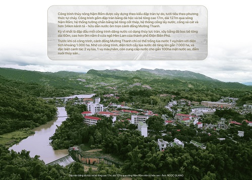 Hơn 50 năm trôi qua, đại thủy nông Nậm Rốm - công trình thủy lợi lớn thứ hai ở miền Bắc, công trình mang đậm dấu ấn sức trẻ của lực lượng thanh niên xung phong (TNXP) tại Điện Biên vẫn ngày đêm đưa nước về tưới tiêu cho cánh đồng Mường Thanh.