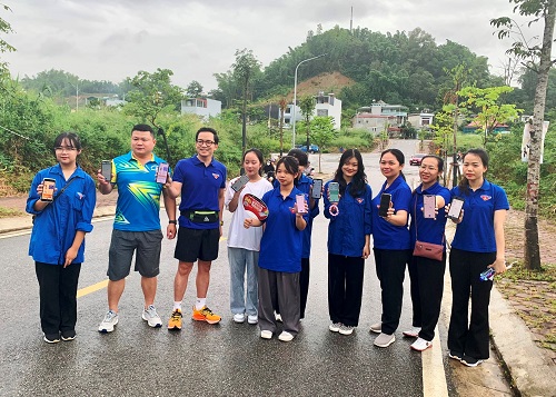 Cán bộ Tỉnh đoàn cùng đoàn viên thanh niên khởi động ứng dụng Uprace để tham gia Giải chạy.