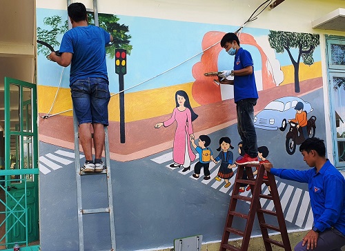 Giảng viên và sinh viên Trường CĐSP Điện Biên đang vẽ tranh tường