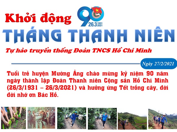 Tháng Thanh niên luôn là tháng khởi đầu cho các hoạt động sôi nổi của tuổi trẻ cả nước nói chung, tỉnh Điện Biên nói riêng, trong đó có huyện Mường Ảng. Đặc biệt hơn, Tháng Thanh niên năm 2021 còn gắn với kỷ niệm 90 năm Ngày thành lập Đoàn TNCS Hồ Chí Minh (26/3/1931-26/3/2021) thì các hoạt động của thanh niên còn mang nhiều dấu ấn của tuổi trẻ xung kích, sáng tạo vì cộng đồng.
