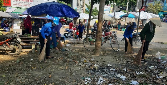 ĐVTN tham gia vệ sinh môi trường, thu gom rác thải nhựa tại khu vực cầu Cơ Khí - Nậm Cản, chợ Trung tâm Cơ Khí thị xã.