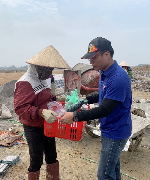 Các tình nguyện viên trao tặng nước cho công nhân tại công trường Dự án đầu tư xây dựng