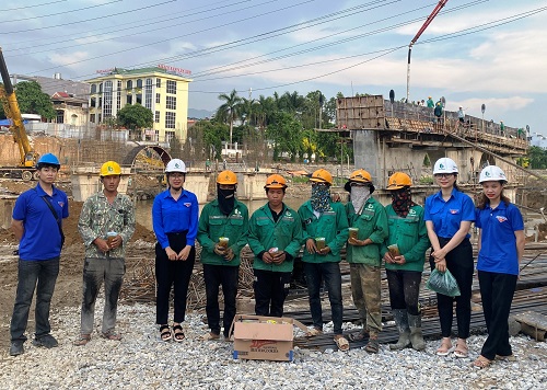 Các tình nguyện viên trao tặng nước cho công nhân tại công trình cầu Thanh Bình, TP. Điện Biên Phủ.