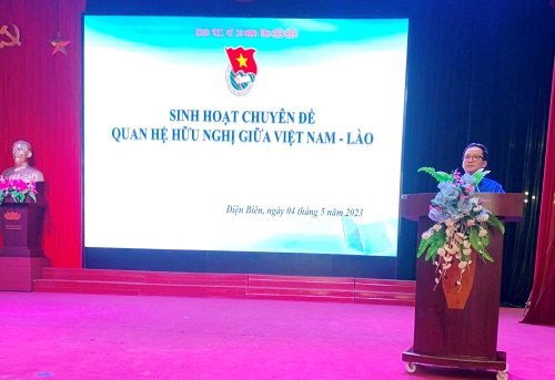 Ngày 04/5/2023, tại Hội trường Nhà thiếu nhi tỉnh Điện Biên, Tỉnh đoàn Điện Biên đã tổ chức sinh hoạt chuyên đề về chủ đề quan hệ hữu nghị giữa Việt Nam - Lào. Đến dự và chỉ đạo có đồng chí Mùa Chiến Thắng - Phó Bí thư Thường trực Tỉnh đoàn, Chủ nhiệm UBKT Tỉnh đoàn; Lãnh đạo, chuyên viên Ban Xây dựng đoàn Tỉnh đoàn cùng hơn 150 cán bộ đoàn, đoàn viên tham dự.