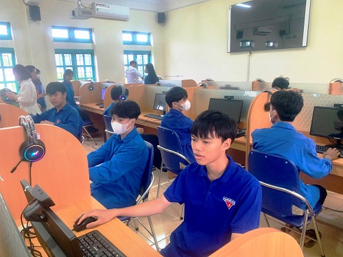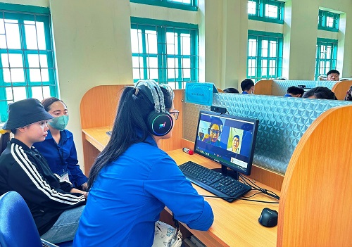 Đoàn viên thanh niên tham gia nghe tư vấn giới thiệu việc làm qua kết nối trực tuyến với các tỉnh.