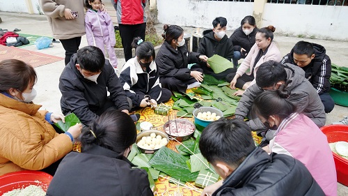 Đoàn viên, thanh niên Nhà trường thi gói bánh Chưng.