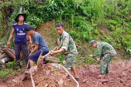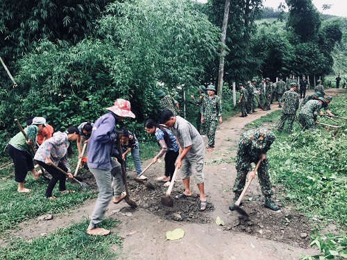 Đội hình “Hành quân xanh” giúp đỡ nhân dân san nền làm nhà tại xã Nà Bủng, huyện Nậm Pồ.