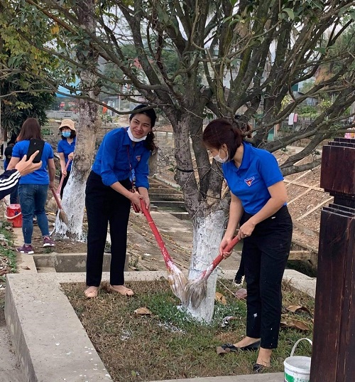 Hình 1: Đoàn phường Him Lam tổ chức quét vôi gốc cây khu vực Kênh tả phường Him Lam. Các “Ngày Chủ nhật xanh” với nhiều hoạt động cụ thể, thiết thực, như: đoàn phường Him Lam, phường Thanh Bình tổ chức quét vôi gốc cây, vệ sinh đường phố khu vực trụ sở Ủy ban nhân dân các phường, xã, tuyến đường thanh niên tự quản; đoàn phường Nam Thanh, phường Noong Bua ra quân khơi thông kênh mương ruộng đồng, phát quang bụi rậm, thu gom rác thải tại các điểm đen ô nhiễm môi trường tại khu dân cư; các đoàn trường THPT trên địa bàn thành phố ra quân vệ sinh môi trường, thu gom rác thải, bóc dỡ quảng cáo dọc các tuyến đường Trường Chinh, đường Võ Nguyên Giáp, một phần tuyến đường quốc lộ 279, khu vực Nghĩa trang liệt sỹ Quốc gia A1… thu hút gần 3.000 đoàn viên thanh niên tham gia;… Các chi đoàn cơ sở ra quân dọn vệ sinh cơ quan, đơn vị với hơn 300 đoàn viên thanh niên tham gia. Các Đoàn xã, phường khác cũng ra quân dọn vệ sinh khuôn viên trụ sở cơ quan, tôn tạo bồn hoa, chăm sóc cây xanh… phù hợp với tình hình thực tế tại địa phương.