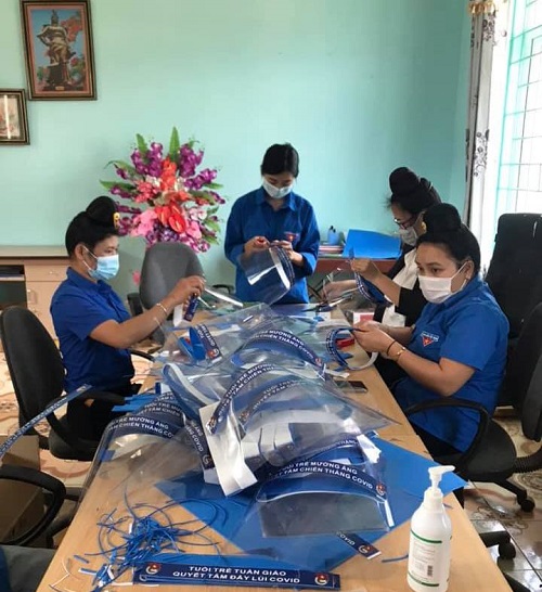 ĐVTN huyện Tuần Giáo tham gia làm kính chắn giọt bắn ủng hộ cho việc phòng chống Covid-19. Song song với việc đẩy mạnh hoạt động tuyên truyền xuống các cơ sở Đoàn thì Ban Thường vụ Huyện đoàn đã khẩn trương huy động lực lượng TNTN tổ chức làm kính chống giọt bắn để trang bị cho các chốt kiểm dịch. Qua triển khai đã làm được 550 kính chống giọt bắn trao cho Huyện đoàn Mường Ảng 50 cái, chốt kiểm dịch của huyện 500 cái.
