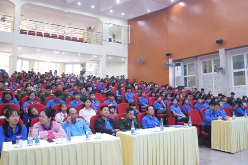 Toàn cảnh chương trình. Tham dự chương trình có đồng chí Mùa Chiến Thắng - Phó Bí thư Thường trực Tỉnh đoàn, Chủ tịch Hội LHTN Việt Nam tỉnh; đồng chí Lò Xuân Hạnh - Phó bí thư Tỉnh đoàn; các đồng chí trong Ban Thường vụ Tỉnh đoàn - Ban thư ký Hội LHTN Việt Nam tỉnh; lãnh đạo và cán bộ các phòng, ban, chuyên môn Tỉnh đoàn, Nhà thiếu nhi tỉnh; các đồng chí lãnh đạo các đơn vị Thành đoàn Điện Biên Phủ, Huyện đoàn Điện Biên, Đoàn Khối Cơ quan và Doanh nghiệp tỉnh, Đoàn trường Cao đẳng Sư phạm Điện Biên, Đoàn trường Cao đẳng Kinh tế - Kỹ thuật Điện Biên, Đoàn thanh niên Công an tỉnh, Đoàn thanh niên Bộ Chỉ huy Quân sự tỉnh, Đoàn thanh niên Bộ đội Biên phòng tỉnh và sự có mặt của gần 300 ĐVTN đại diện đoàn viên, hội viên thanh niên trong toàn tỉnh cùng phóng viên Báo Điện Biên Phủ, Đài Phát thanh truyền hình tỉnh đến dự và đưa tin chương trình.