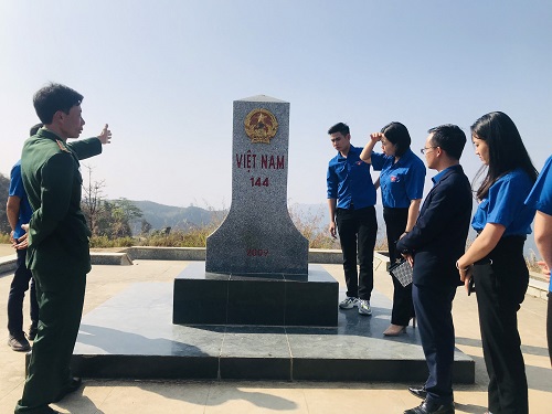 Đoàn viên thanh niên nhà trường được cán bộ Đồn Biên phòng giới thiệu về cột mốc,