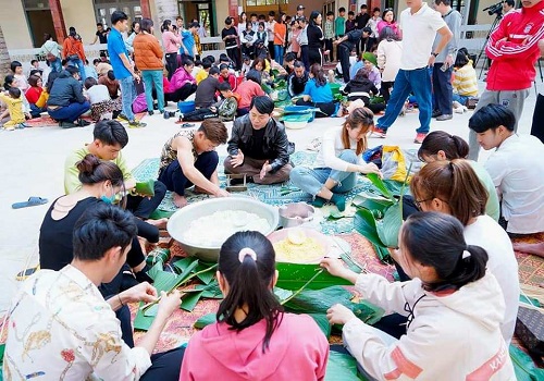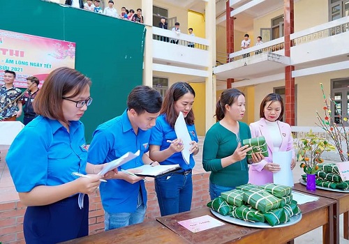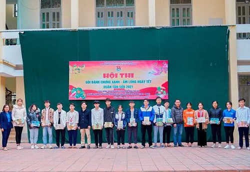 Bên cạnh đó, Đoàn trường tổ chức Hội thi “Gói Bánh chưng xanh - Ấm lòng ngày Tết xuân Tân Sửu 2021” được tổ chức trong niềm vui, sự hân hoan và phấn khởi của học sinh, sinh viên toàn trường. Đây không chỉ là sân chơi giúp các bạn thể hiện sự tài năng, khéo léo của mình mà còn là cơ hội quý giá để trải nghiệm một trong những hoạt động nổi bật của dịp Tết cổ truyền. Hội thi với sự tham gia của hơn 400 đoàn viên, thanh niên thuộc 28 chi đoàn (07 đội thi). Nguyên liệu như lá dong, lạt giang, gạo nếp, đậu xanh, thịt ba chỉ…được các đội chuẩn bị từ trước. Mỗi đội tự chọn lựa những đoàn viên, thanh niên khéo tay để gói bánh Chưng và bánh Gù của dân tộc Thái. Sau khi gói và luộc xong, các đội thi sẽ nộp sản phẩm và thuyết trình về cách làm, ý nghĩa của những chiếc bánh trong dịp Tết nguyên đán. Ban Giám khảo sẽ tiến hành chấm điểm dựa vào các tiêu chí như kích thước, khối lượng, hình thức, thành phẩm… bình chọn và trao giải cho các đội đạt điểm cao. Tại Hội thi lần này, dưới sự khéo léo của đoàn viên, thanh niên các chi đoàn trong toàn trường đã gói được 230 chiếc bánh Chưng, 96 chiếc bánh Gù của dân tộc Thái đạt yêu cầu chất lượng. Bên cạnh đó, Đoàn trường tổ chức các trò chơi tập thể, giao lưu văn nghệ, múa sạp và đốt lửa trại…
