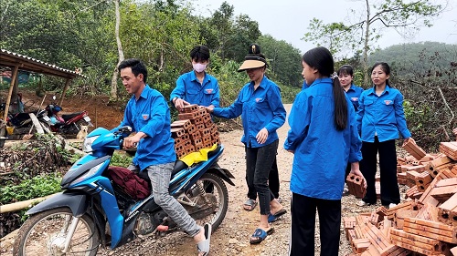 Đoàn viên, thanh niên tình nguyện tham gia vận chuyển vật liệu hỗ trợ làm nhà