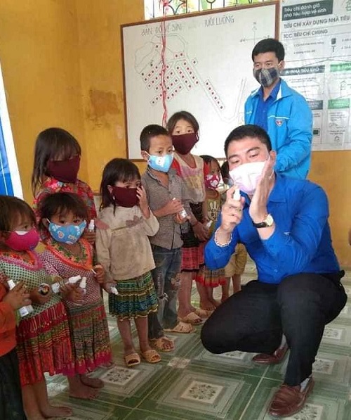 ĐVTN Hướng dẫn rửa tay bằng xà phòng, dung dịch sát khuẩn cho các em học sinh.