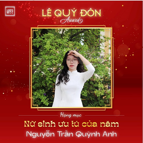 Với những thành tích đạt được, em Nguyễn Trần Quỳnh Anh xuất sắc đạt danh hiệu “Học sinh 3 tốt” cấp Tỉnh năm học 2022 – 2023; được khen thưởng là thành viên CLB Truyền thông MCC có nhiều đóng góp trong công tác đoàn và phong trào đoàn thanh niên trường học nhiệm kì 2022 – 2023 và là cá nhân có thành tích xuất sắc trong công tác Đoàn và phong trào thanh niên trường học, học kì I, năm học 2023 – 2024.