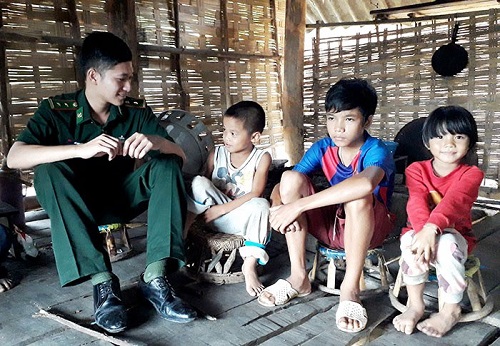 Thượng úy Đỗ Xuân Điềm thăm hỏi và động viên học sinh có hoàn cảnh khó khăn