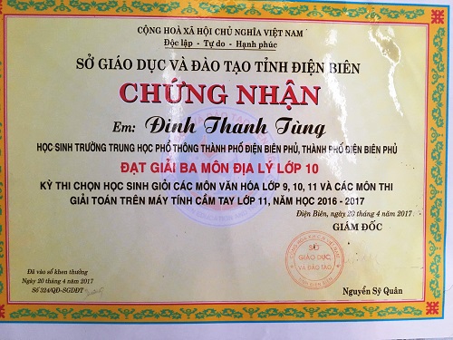Đinh Danh Tùng - học sinh lớp 12C3 trường THPT Thành phố Điện Biên Phủ, tỉnh Điện Biên, em là một trong những học sinh có hoàn cảnh khó khăn thậm chí các em không có cơ hội được bao bọc bởi vòng tay ấm áp của người cha yêu dấu hay người mẹ dịu hiền. Tuy nhiên trước những khó khăn, thiệt thòi như vậy, em vẫn không chùn bước mà luôn vượt khó vươn lên để đạt được những kết quả cao trong học tập.